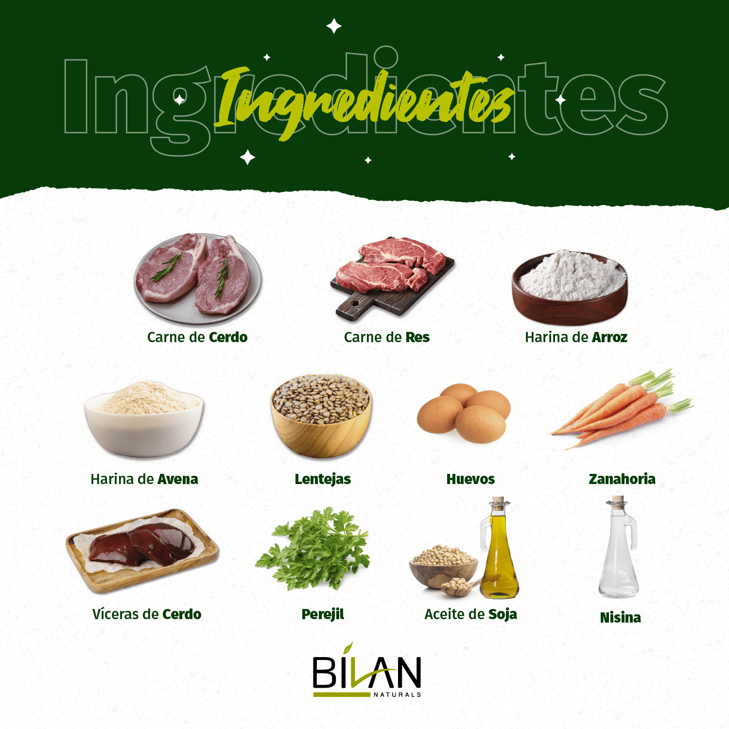 Carne cerdo, carne de res, harina de arroz, harina de avena, lenteja, zanahoria, huevo, perejil, vísceras de cerdo, aceite de soya, fosfato di-cálcico, suplemento vitamínico/minerales, conservante natural (vinagre blanco), sal y palatabilizante natural
