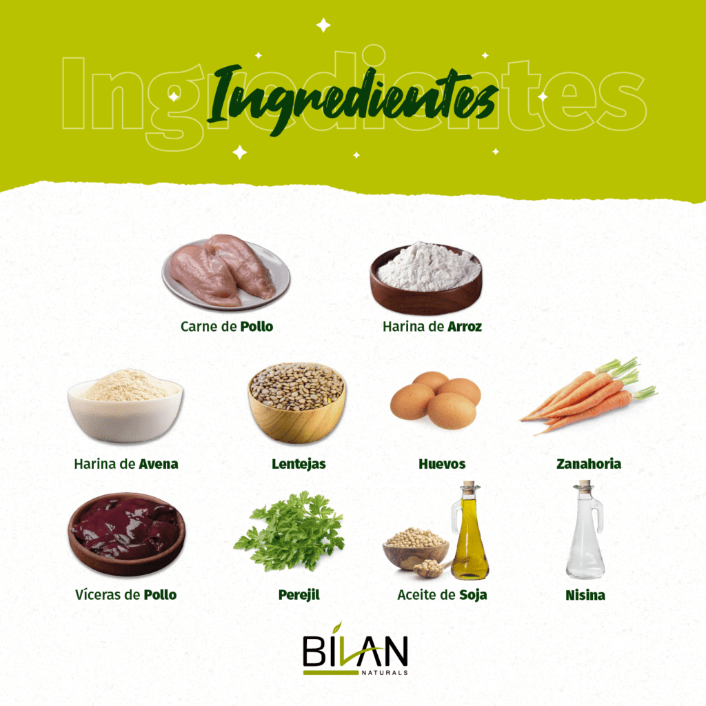 Carne de pollo, harina de arroz, harina de avena, lenteja, huevo, zanahoria, vísceras de pollo, perejil, aceite de soya, fosfato di-cálcico, suplemento vitamínico/minerales, conservante natural (vinagre blanco), sal y palatabilizante natural